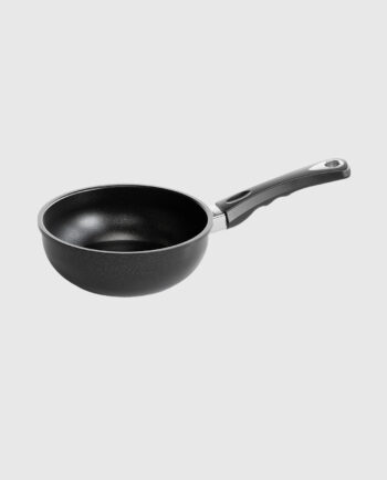 Podczas gdy cieńsze patelnie grillowe przejmują temperaturę zimnego mięsa, przez co stek traci naturalne soki i wysycha, patelnia BBQ AMT dłużej zatrzymuje ciepło i nie wychładza się w kontakcie z mięsem. Jest to możliwe dzięki grubej podstawie (8-9mm), pokrytej dodatkowo powłoką zapobiegającą przywieraniu oraz umożliwiającą smażenie bez oleju.